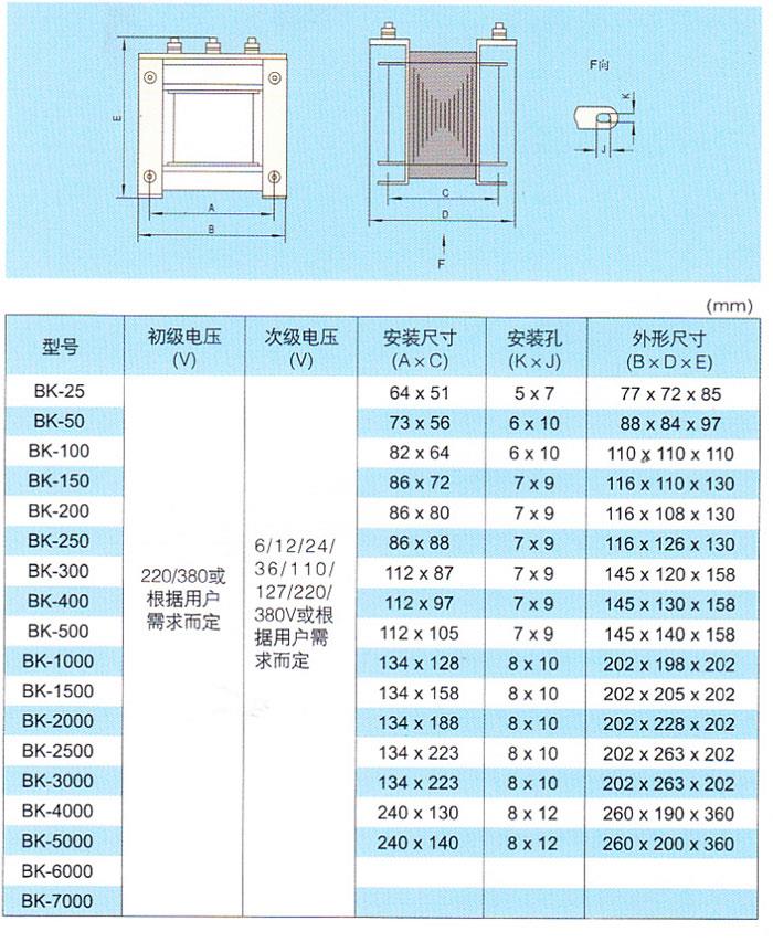 BK系列控制变压器适用于50-60Hz的交流电路中,作为机床和机械设备中一般电器的控制电源、局部照明及指示灯电源。